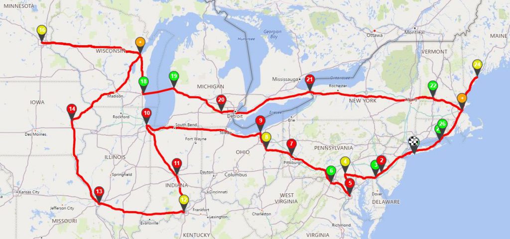 Über den Web-Routenplaner www.multiroute.de berechnet und kürzeste Strecke als Option gesetzt (nur dort wollte er die Fähre über den Lake Michigan nehmen).